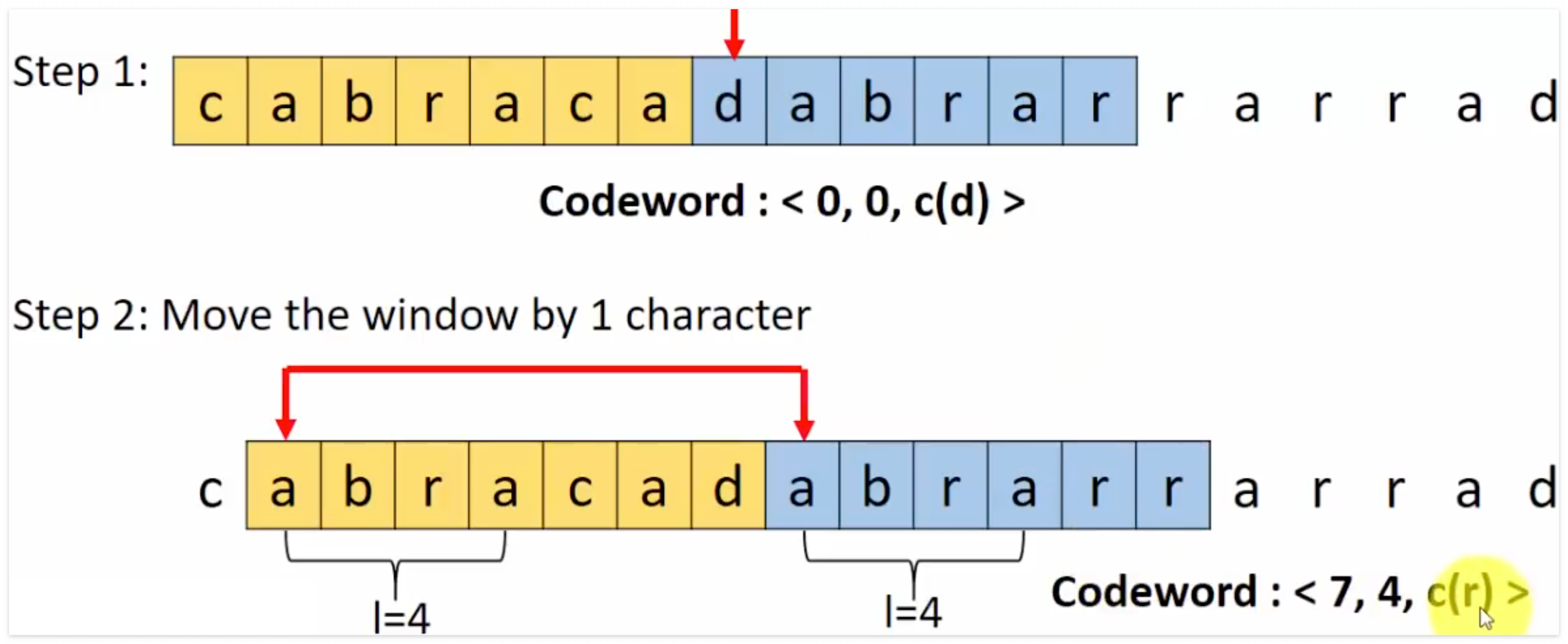 - Step2: 이제 서치버퍼와 룩어헤드 버퍼가 일치하는 시퀀스를 찾았습니다. 두 시퀀스의 시작점간의 거리(DIstance)가 7칸, 그리고 일치되는 시퀀스의 길이(Length)가 4칸, 그리고 다음 문자가 r 이어서 (7,4,'r') 로 데이터가 인코딩 됩니다.
