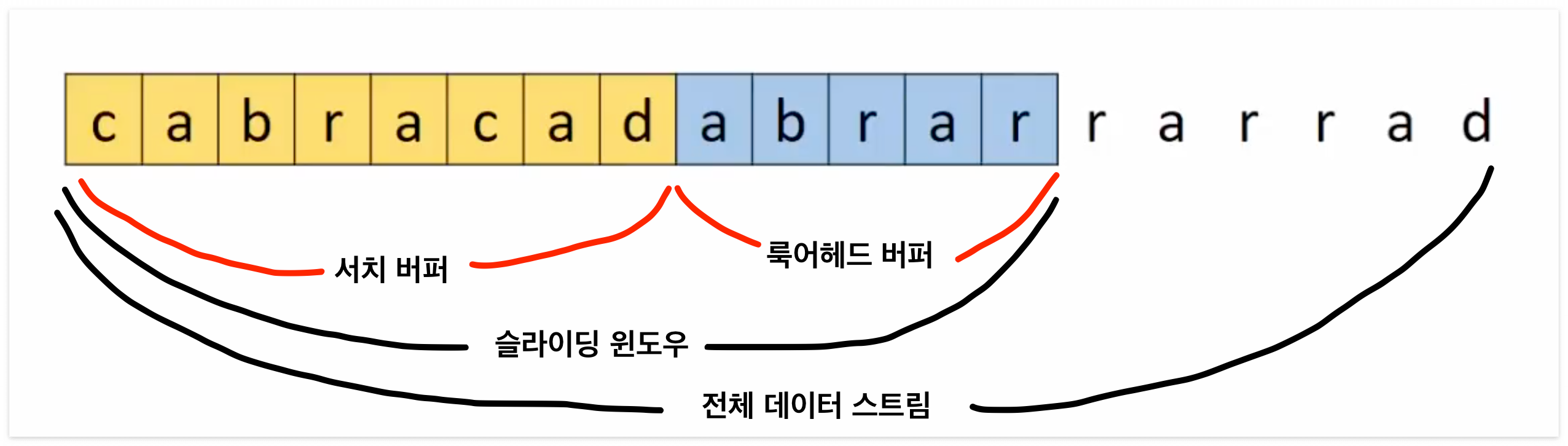 LZ77 알고리즘은 일정한 크기의 데이터 스트림을 읽는데 이를 슬라이딩 윈도우라고 합니다. 이 슬라이딩 윈도우는 다시 2개로 나뉘는데요, 이미 인코딩된 데이터로 구성되며, 이후에 읽어들일 데이터에 사전 역할을 하는 서치 버퍼(Search Buffer)와 이제 읽어들여서 인코딩될 대상인 룩어헤드 버퍼(Look ahead Bugger) 입니다.