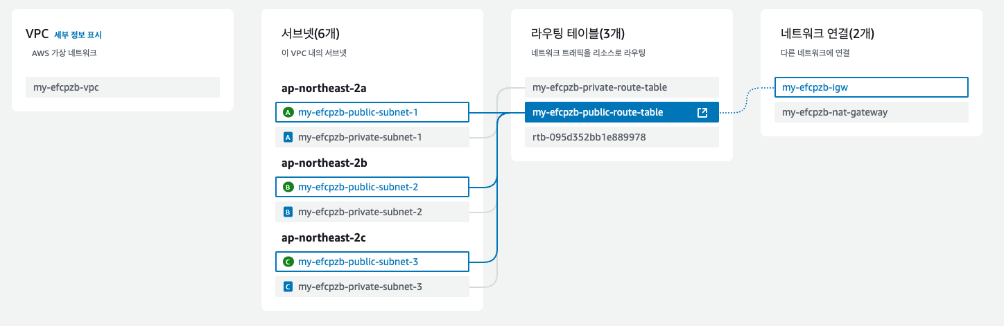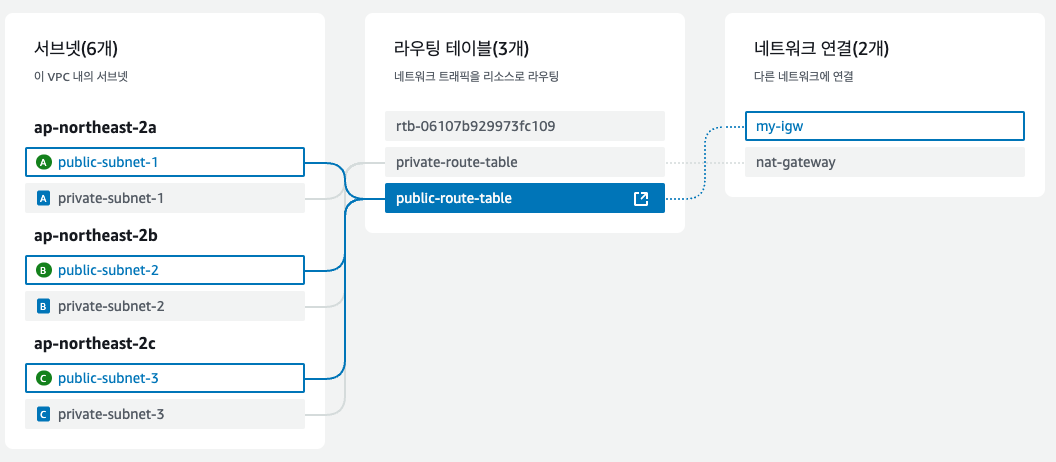 - 퍼블릭 라우팅 테이블: 트래픽이 인터넷 게이트웨이(IGW)를 통해 외부 인터넷으로 이동하도록 설정.