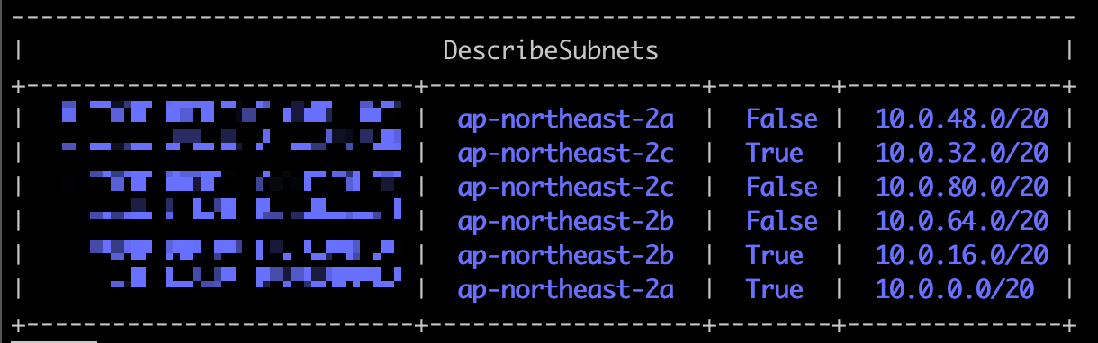 --query "Subnets[*].[SubnetId, AvailabilityZone, MapPublicIpOnLaunch, CidrBlock]" \