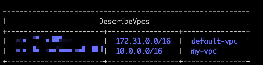 이런 결과를 반환한다. 원래 AWS 에서 기본으로 제공해주던 VPC 외에 위의 스크립트 때문에 생성된 my-vpc 가 보인다. 이 vpc 의 id를 이용하여 subent 들을 조회할 수 있다.