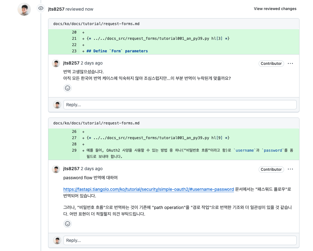 회사에서 FastAPI 로 전환을 하기에 FastAPI Document 를 보면서 공부중이었다. 한국어로 번역된 문서도 있는반면 영어 그대로인 문서들도 있었다. 왜일까? 하고 찾아보던중 FastAPI Github 에서 번역활동이 진행중이며, 한국인 번역 참여자는 16명 정도라는 것을 알게 되었다.