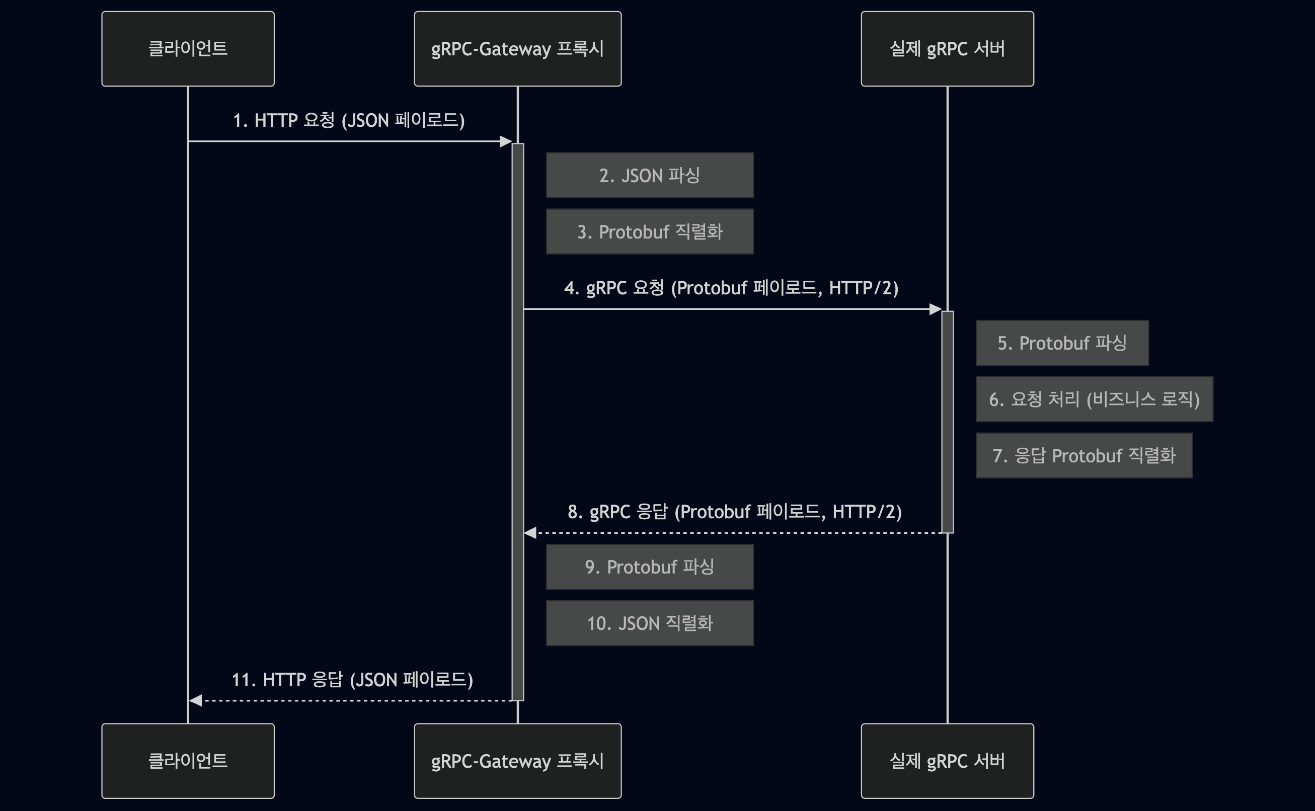 클라이언트가 REST API처럼 HTTP 요청 (GET, POST 등)을 보내면 gRPC-Gateway가 이 요청을 받아서 내부적으로 gRPC 호출로 변환하고 최종적으로 gRPC 서버에 요청을 전달합니다.
